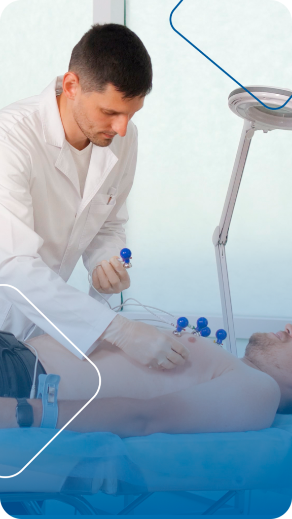 É um teste simples que detecta e registra atividade elétrica do coração para localizar problemas cardíacos.